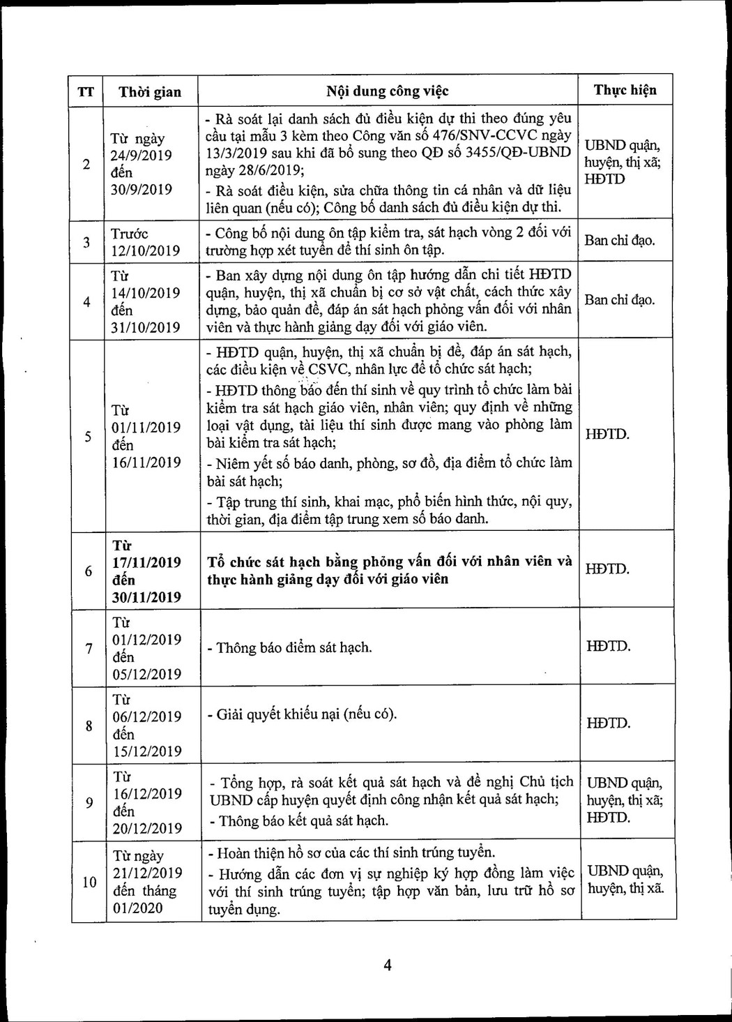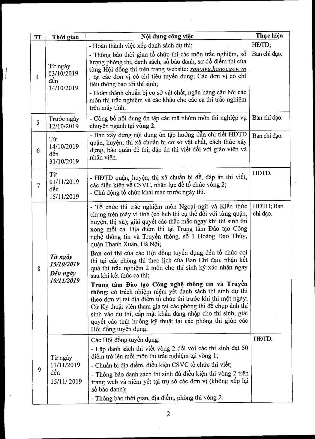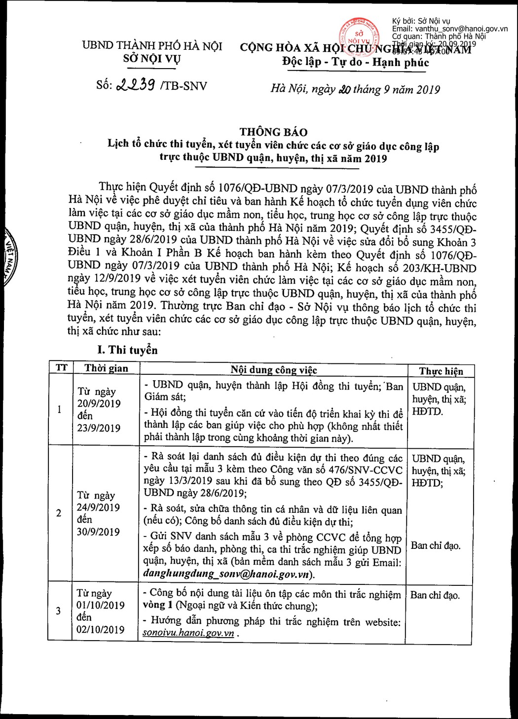 Thực hiện Quyết định số 1076/QĐ-UBND ngày 07/3/2019 của UBND thành phố Hà Nội về việc phê duyệt chỉ tiêu và ban hành Kế hoạch tổ chức tuyển dụng viên chức làm việc tại các cơ sở giáo dục mầm non, tiểu học, trung học cơ sở công lập trực thuộc UBND quận, huyện, thị xã của thành phố Hà Nội năm 2019; Quyết định số 3455/QĐ-UBND ngày 28/6/2019 của UBND thành phố Hà Nội về việc sửa đổi bổ sung Khoản 3 Điều 1 và Khoản I Phần B Kế hoạch ban hành kèm theo Quyết định số 1076/QĐ-UBND ngày 07/3/2019 của UBND thành phố Hà Nội; Kế hoạch số 203/KH-UBND ngày 12/9/2019 về việc xét tuyển viên chức làm việc tại các cơ sở giáo dục mầm non, tiểu học, trung học cơ sở công lập trực thuộc UBND quận, huyện, thị xã của thành phố Hà Nội năm 2019. Thường trực Ban chỉ đạo – Sở Nội vụ thông báo lịch tổ chức thi tuyển, xét tuyển viên chức các cơ sở giáo dục công lập trực thuộc UBND quận, huyện, thị xã chức như sau: