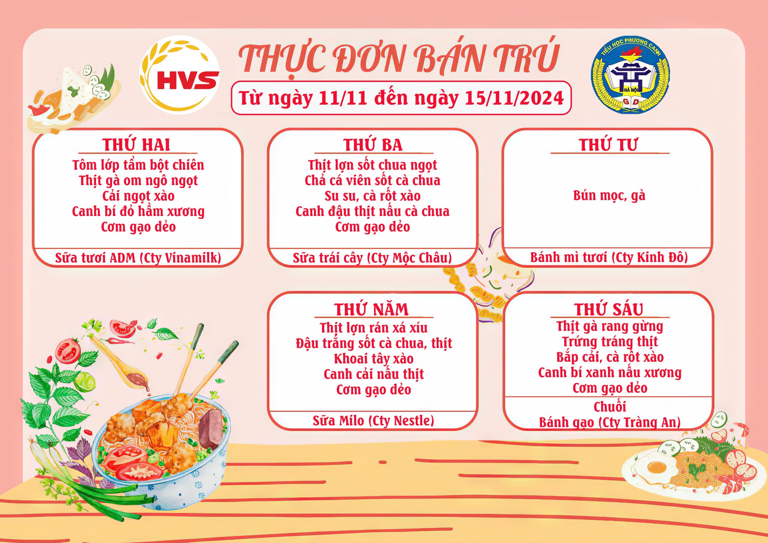 Thực đơn bán trú từ ngày 11/11 đến 15/11